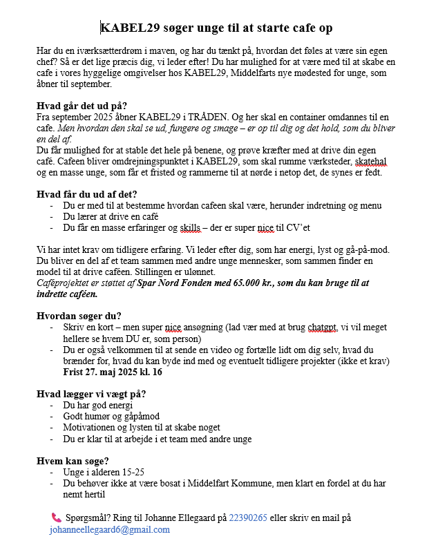 Der var det tydeligt, at hun har et stort hjerte for iværksætteri og forretningsudvikling og derfor bliver den første opgave, Johanne står i spidsen for, at finde nogle unge, der vil være med at skabe, udvikle og drive KABEL29’s cafe. Hun har udsendt et Open Call, hvor de søger efter ildsjæle, som er interesseret i hvordan det fungerer, at starte en forretning op. Alt fra indkøb, drift til lønninger og salg.